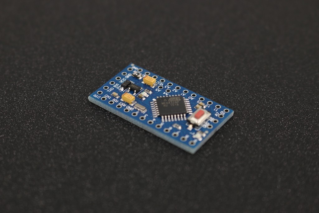 The Pro Mini is a microcontroller board base on the ATmega328P. It has 14 digital input/output pins (of which 6 can be used as PWM outputs), 6 analog inputs, an on-board resonator, a reset button, and holes for mounting pin headers.