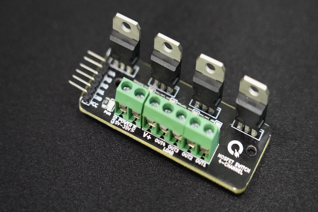 P55NF06-4Channel MOSFET Driver Module is a breakout board for the P55NF06MOSFET transistor. The module is designed to switch heavy DC loads from a single digital pin of your microcontroller.